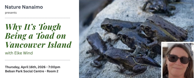 The nine native amphibian species on Vancouver Island live in a variety of habitats, and vary in their life history and sensitivity to human disturbance. Ms. Wind will discuss the ecology of our local amphibian populations with an emphasis on the Western Toad, a species at risk that she has been studying for almost 15 years.